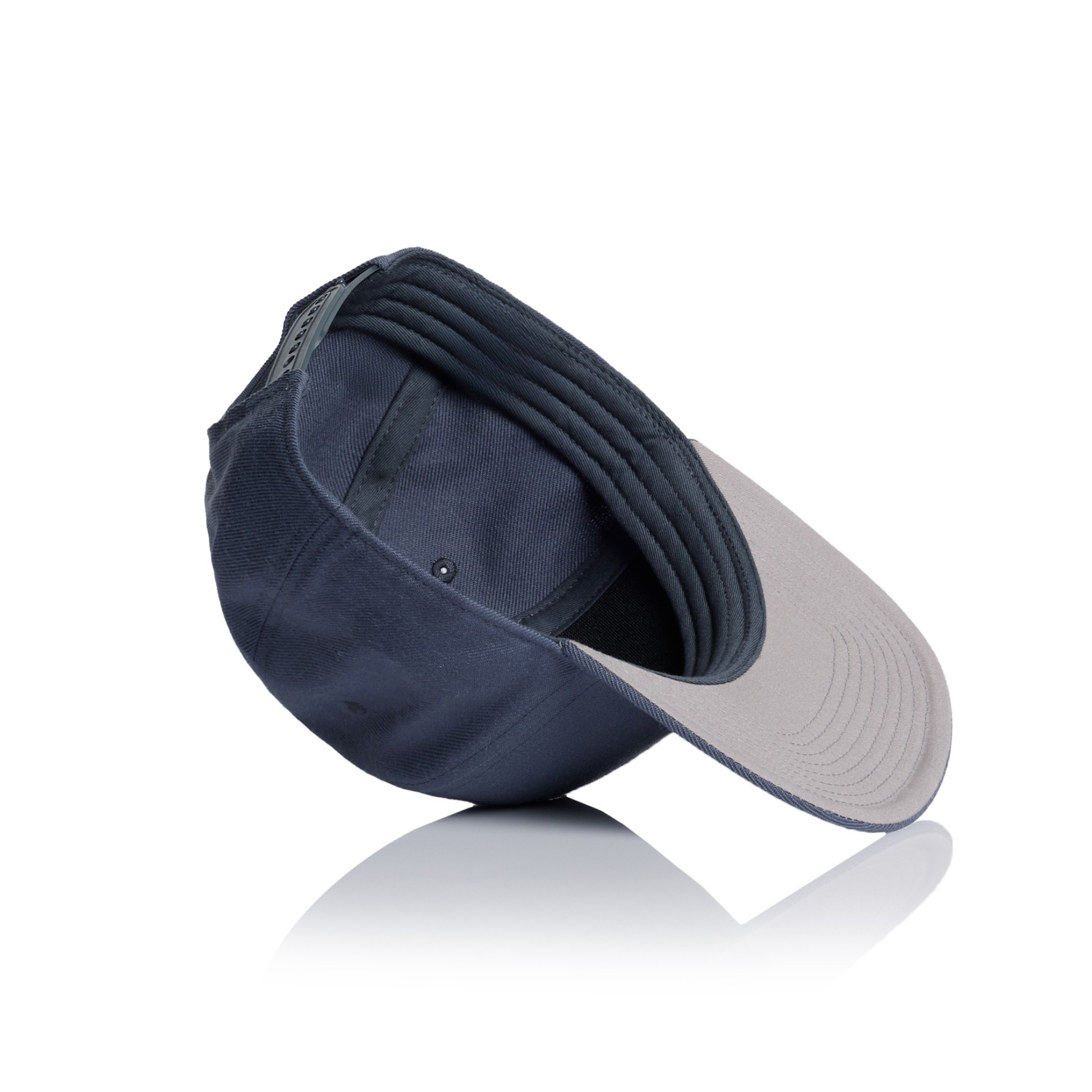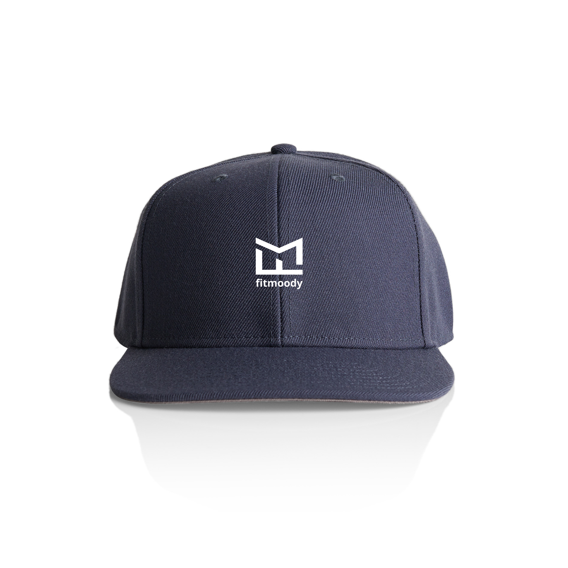 A high-profile snapback cap with a flat peak, crafted from mid-weight 80% acrylic and 20% wool blend. Features include a plastic snapback closure, light grey under-peak lining, stitching eyelets for ventilation, and a self-fabric dome at the top. One size fits all.